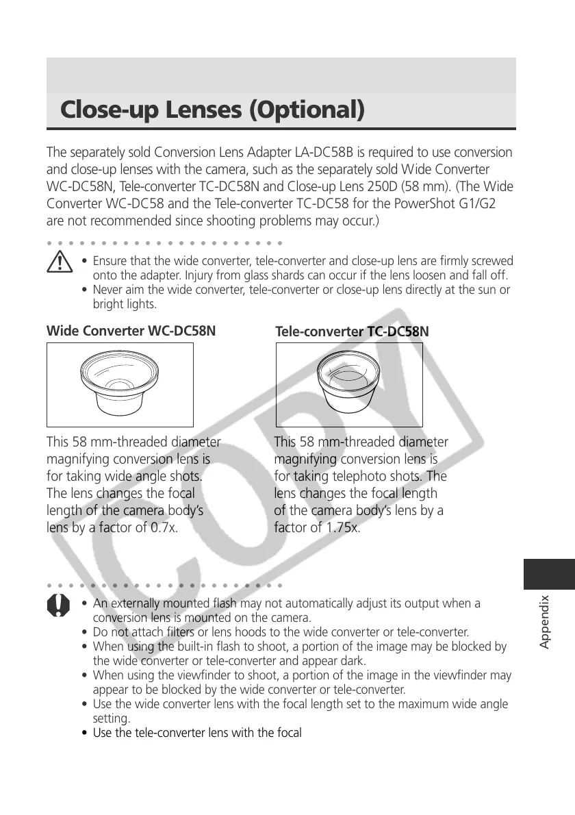 Converter WC-DC58 and the Tele-converter TC-DC58 for the PowerShot G1/G2