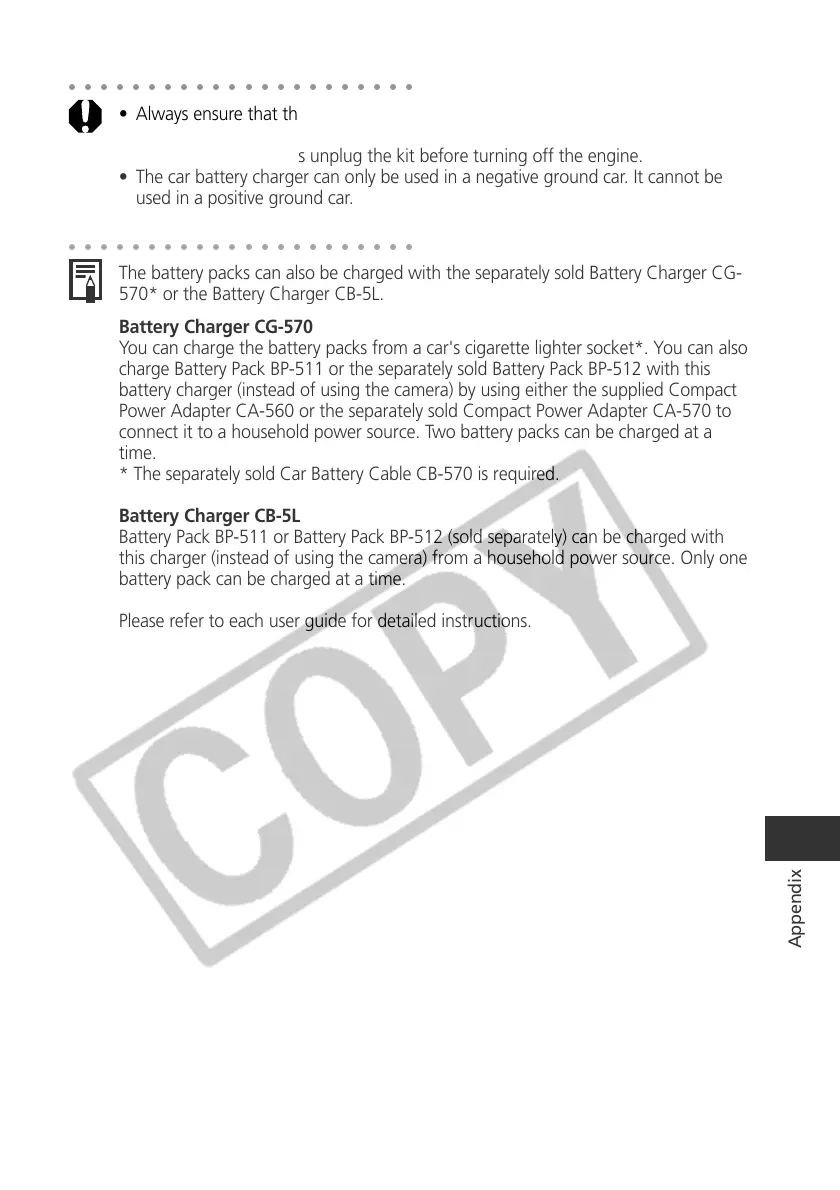 • The car battery charger can only be used in a negative ground car. It cannot be
