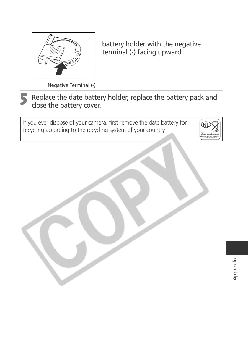 If you ever dispose of your camera, first remove the date battery for