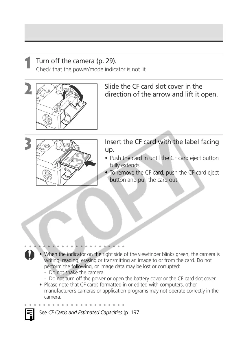 - Do not turn off the power or open the battery cover or the CF card slot cover.