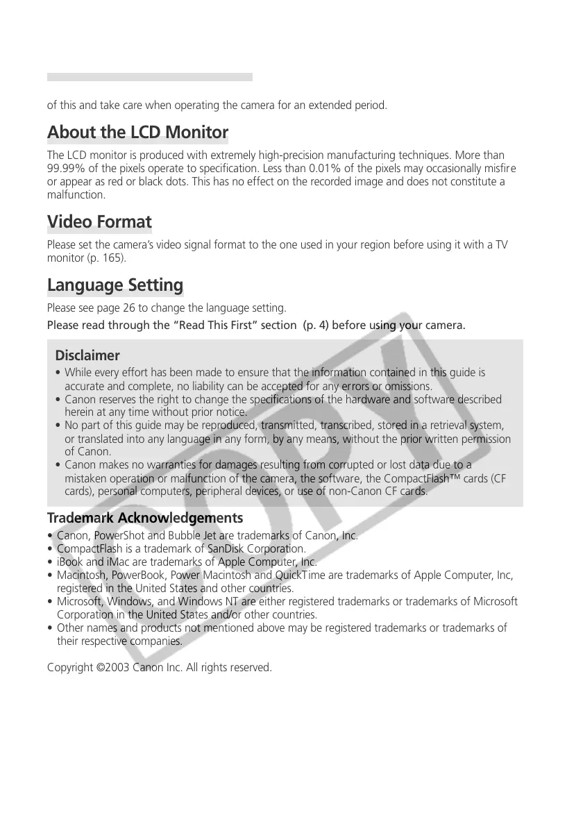 • Canon makes no warranties for damages resulting from corrupted or lost data due to a
