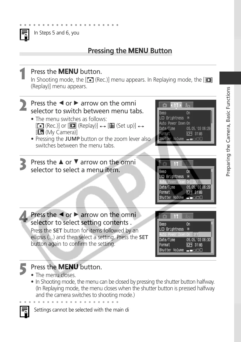 (In Replaying mode, the menu closes when the shutter button is pressed halfway