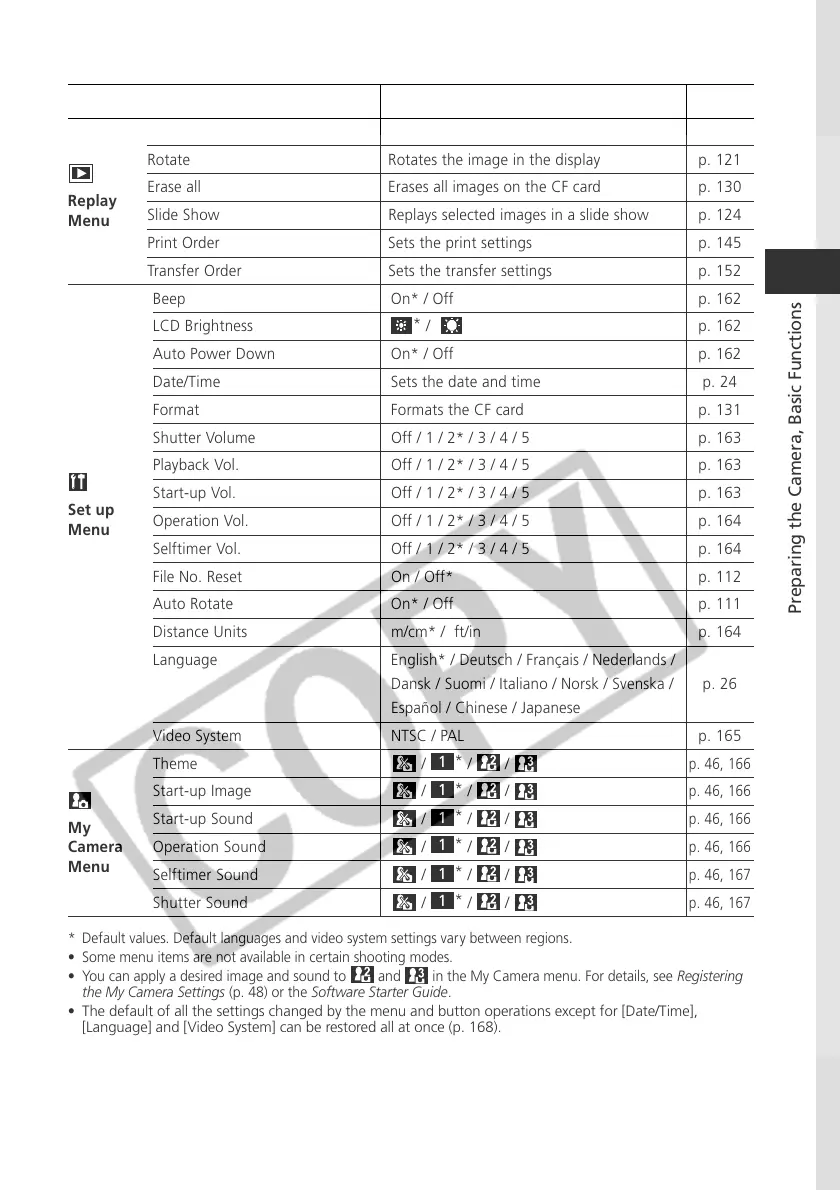 Playback Vol. Off / 1 / 2* / 3 / 4 / 5 p. 163