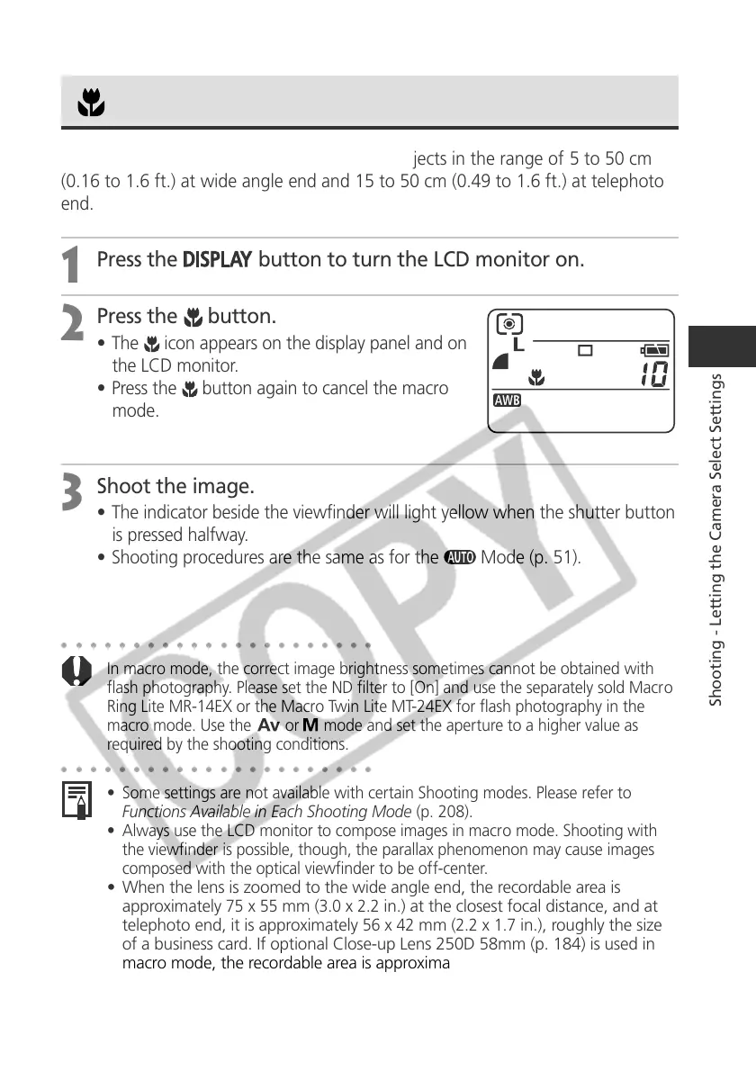 • Always use the LCD monitor to compose images in macro mode. Shooting with