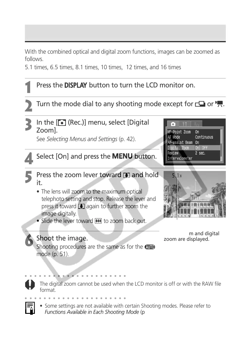 The digital zoom cannot be used when the LCD monitor is off or with the RAW file