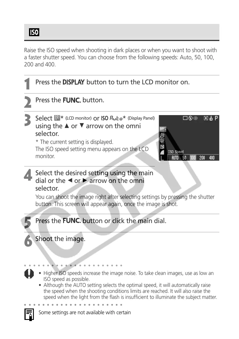 • Higher ISO speeds increase the image noise. To take clean images, use as low an