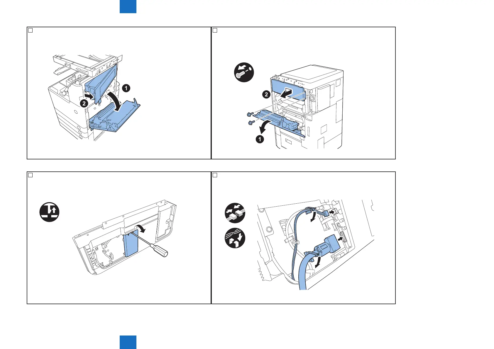 Open the right lower cover, then remove 2 screws to remove the right upper cover of