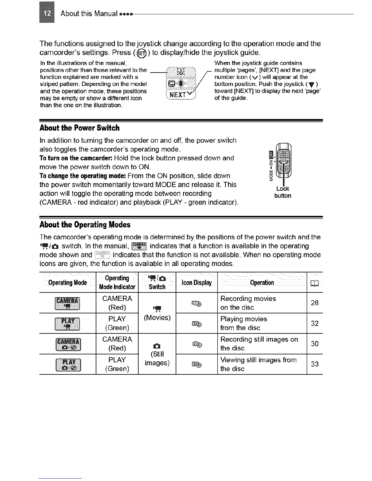 The camcorder's operating mode isdetermined by the positions of the power switch and the