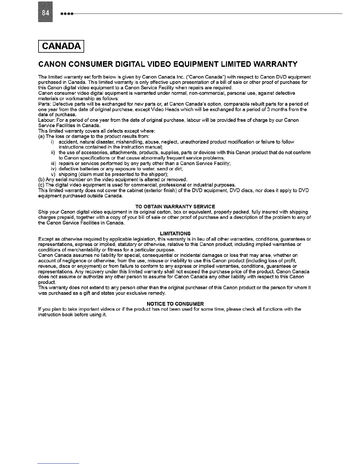 CANON CONSUMER DIGITAL VIDEO EQUIPMENT LIMITED WARRANTY