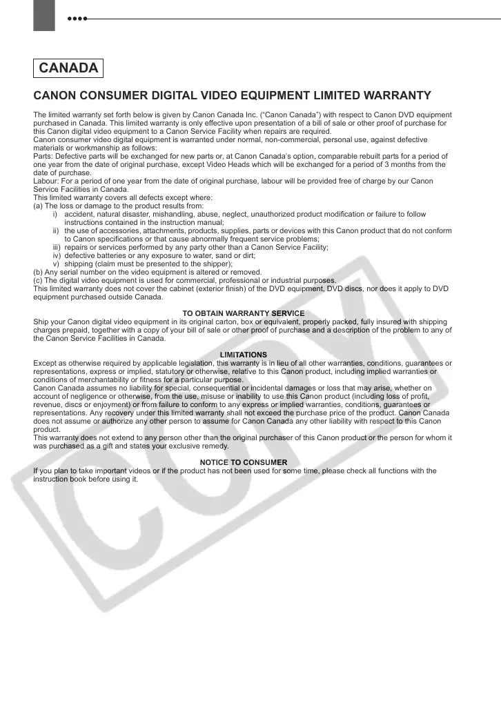 Canon consumer video digital equipment is warranted under normal, non-commercial, personal use, against defective