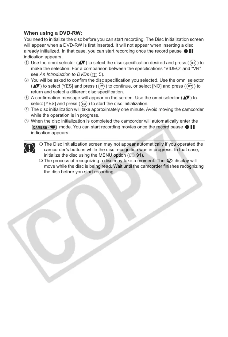When the disc initialization is completed the camcorder will automatically enter the