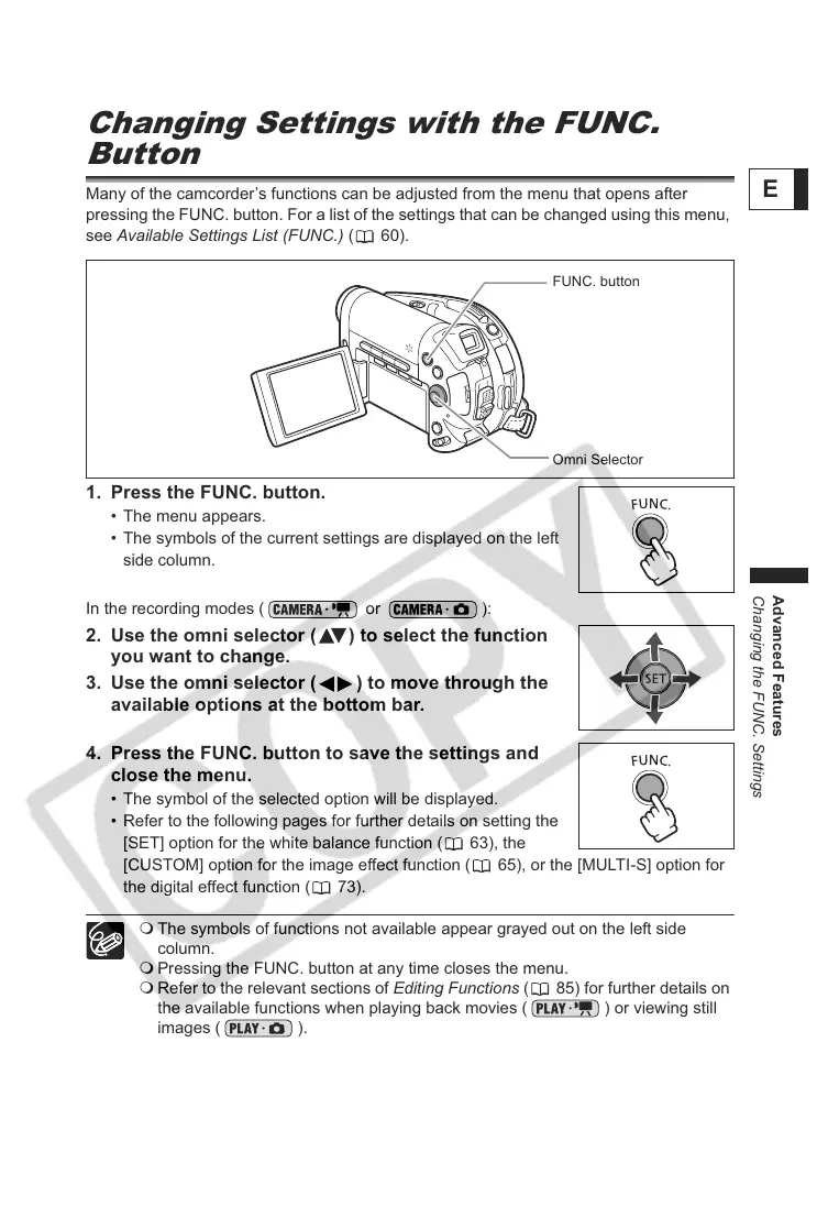 pressing the FUNC. button. For a list of the settings that can be changed using this menu,