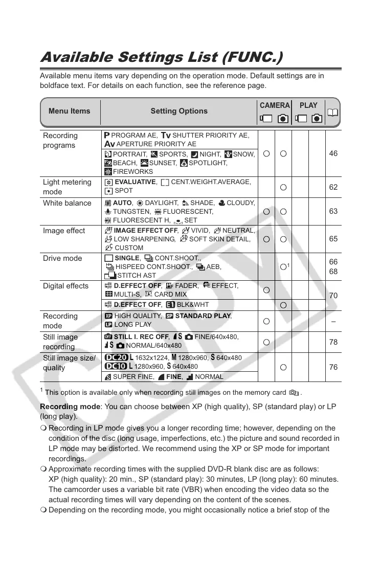 Approximate recording times with the supplied DVD-R blank disc are as follows: