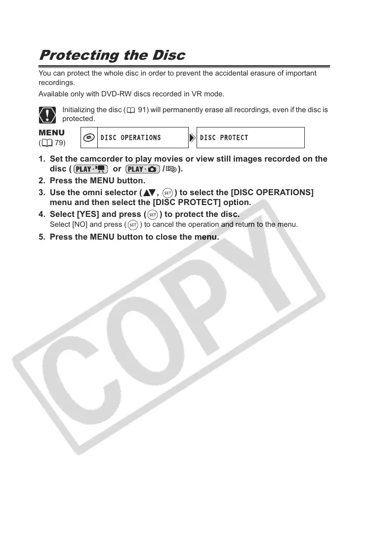 Initializing the disc ( 91) will permanently erase all recordings, even if the disc is