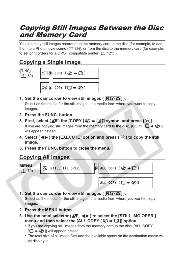 them to a Photomovie scene ( 89)), or from the disc to the memory card (for example,