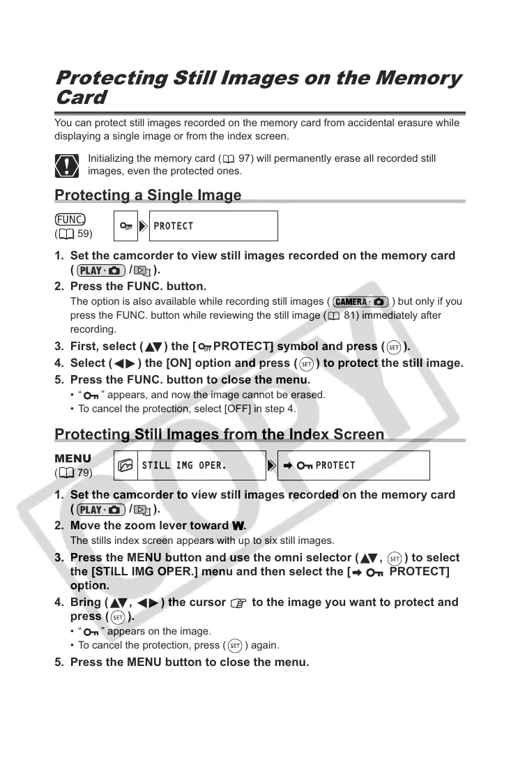 Initializing the memory card ( 97) will permanently erase all recorded still