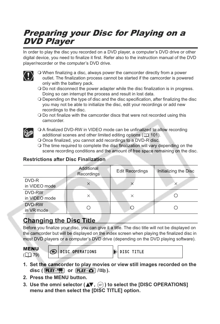 the camcorder but will be displayed on the index screen when playing the finalized disc in