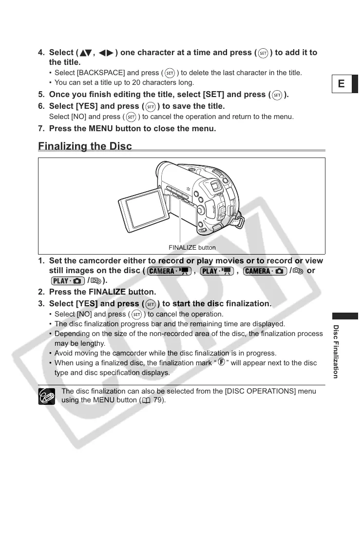 • Avoid moving the camcorder while the disc finalization is in progress.