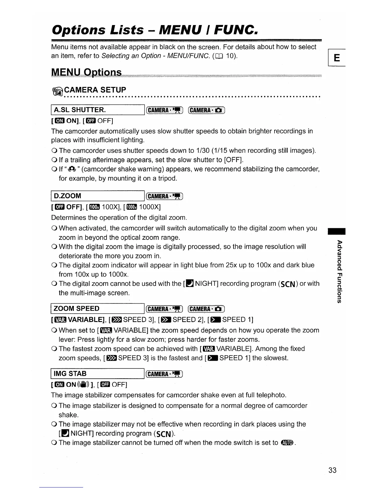 a The camcorder uses shutter speeds down to 1/30 (1/15 when recording still images).
