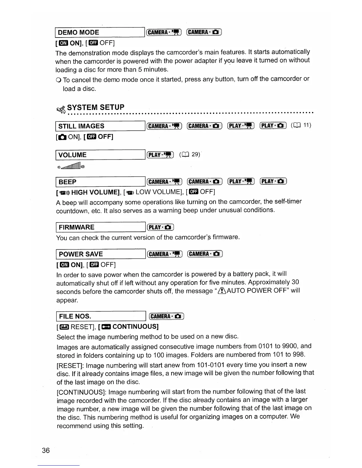 The demonstration mode displays the camcorder's main features. It starts automatically