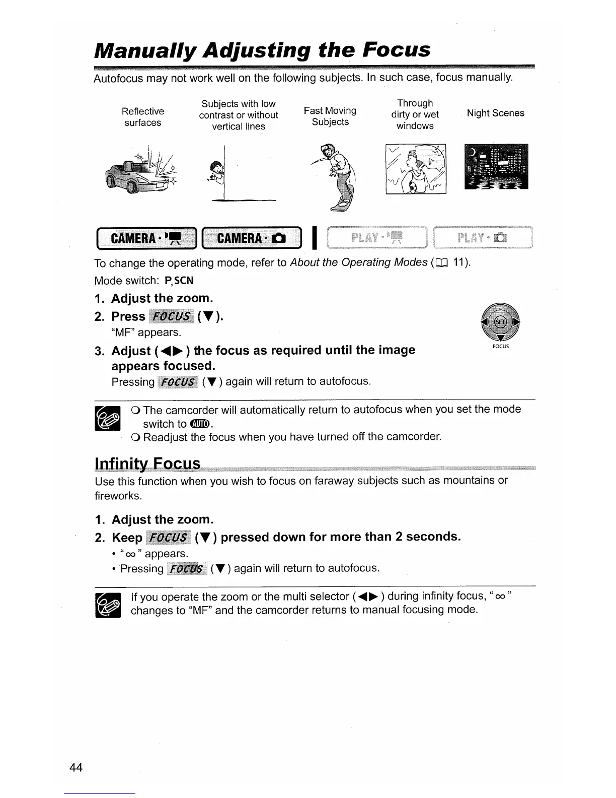changes to "MF" and the camcorder returns to manual focusing mode.