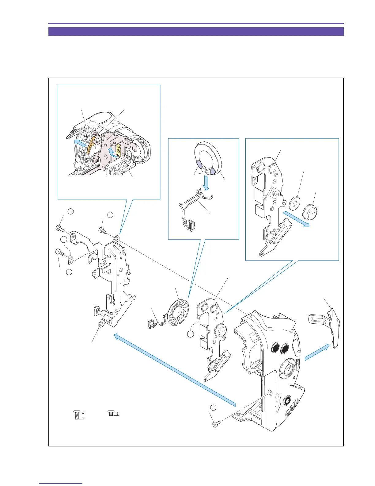 (1) Remove four screws (i × 3, k × 1), and detach the Key Frame, the Speaker, and the Rear Key FPC Ass'y.