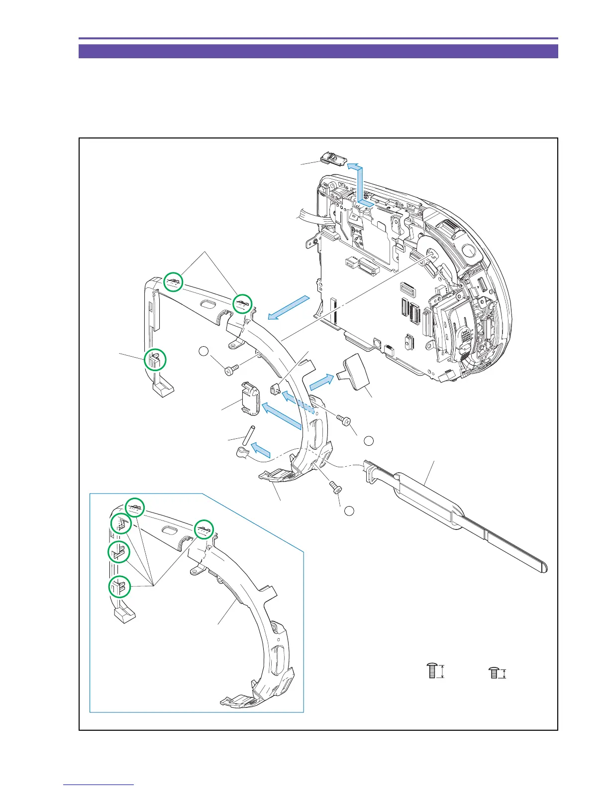(3) Detach the LED window, the Grip Belt Pin, and the Rear Grip Belt from the Center Cover.