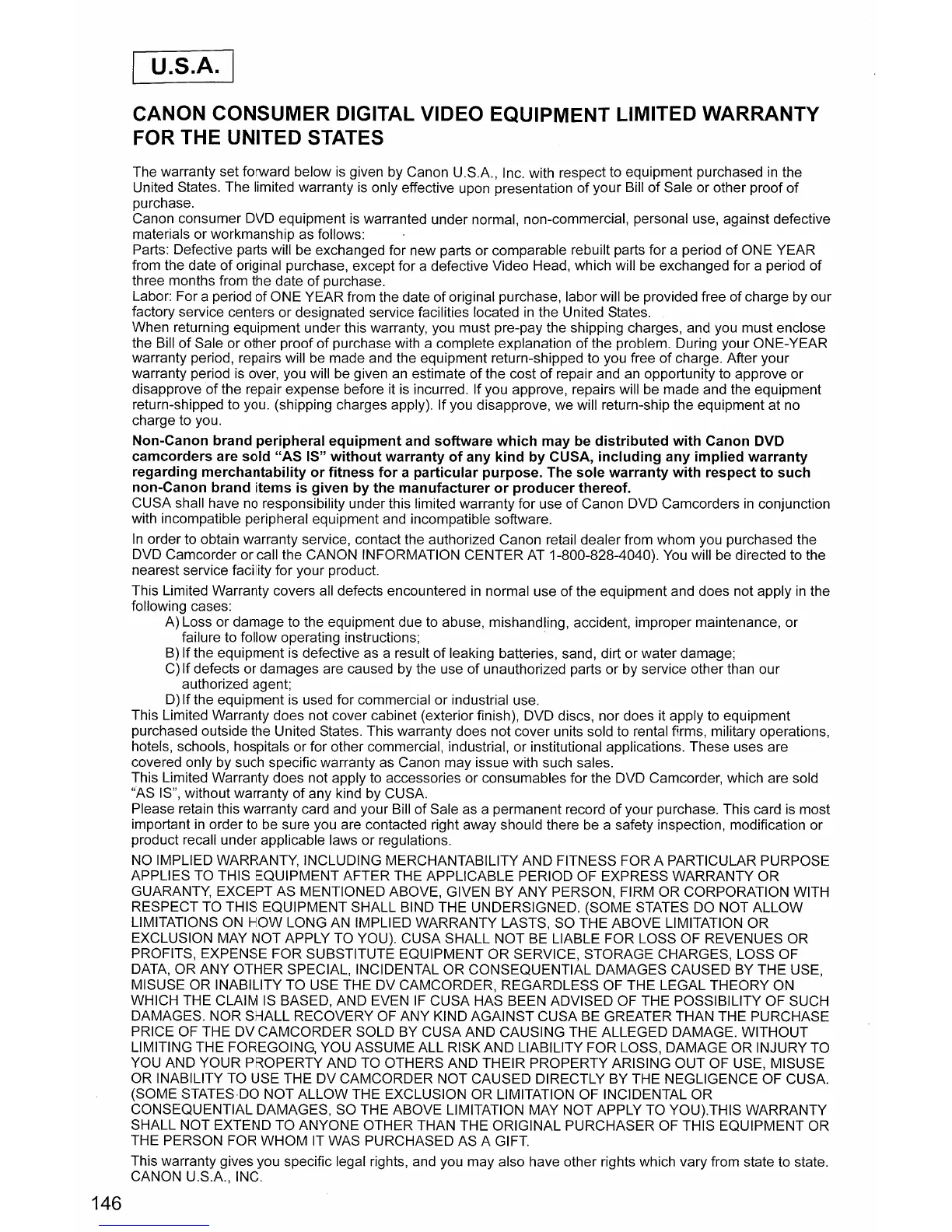 CANON CONSUMER DIGITAL VIDEO EQUIPMENT LIMITED WARRANTY