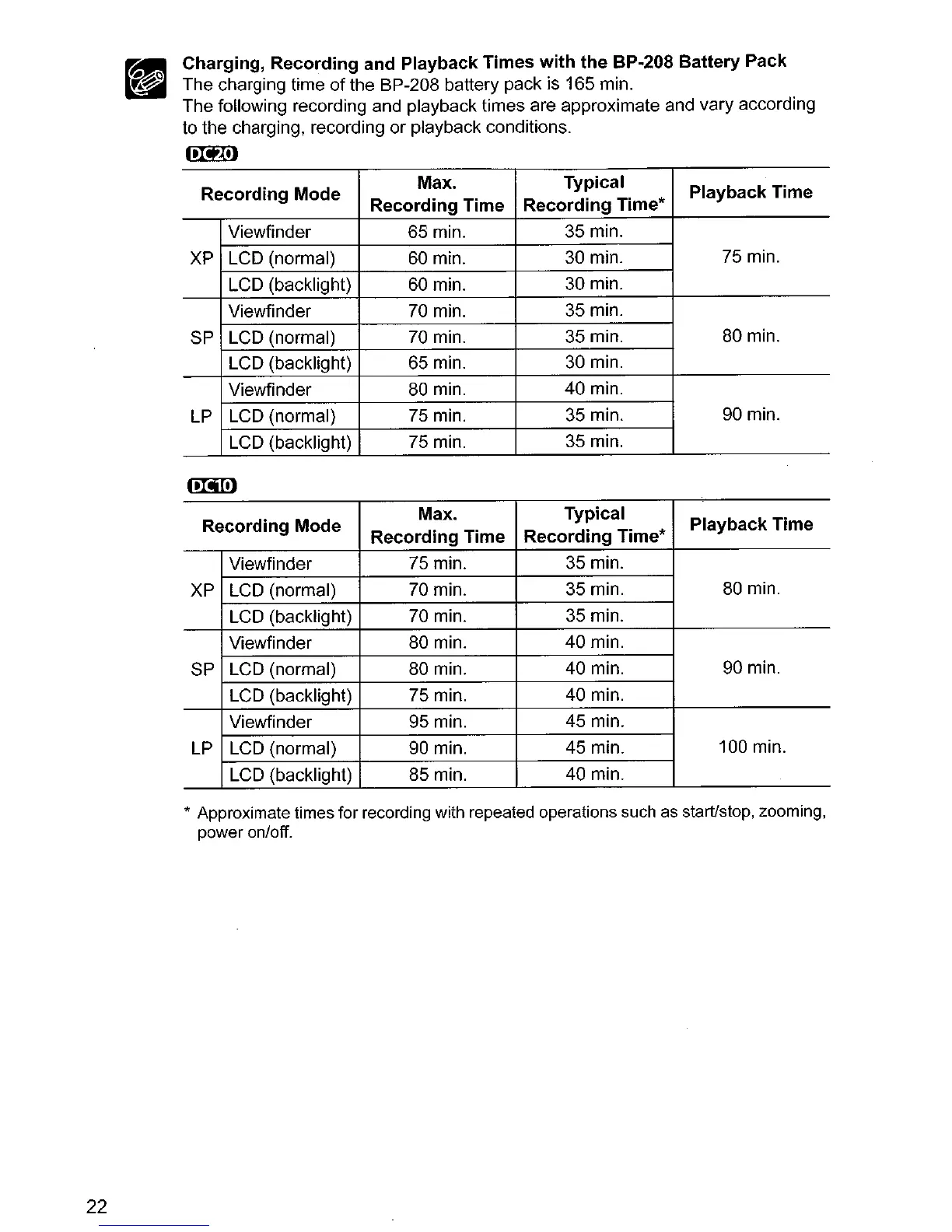 * Approximate times for recording with repeated operations such as start/stop, zooming,
