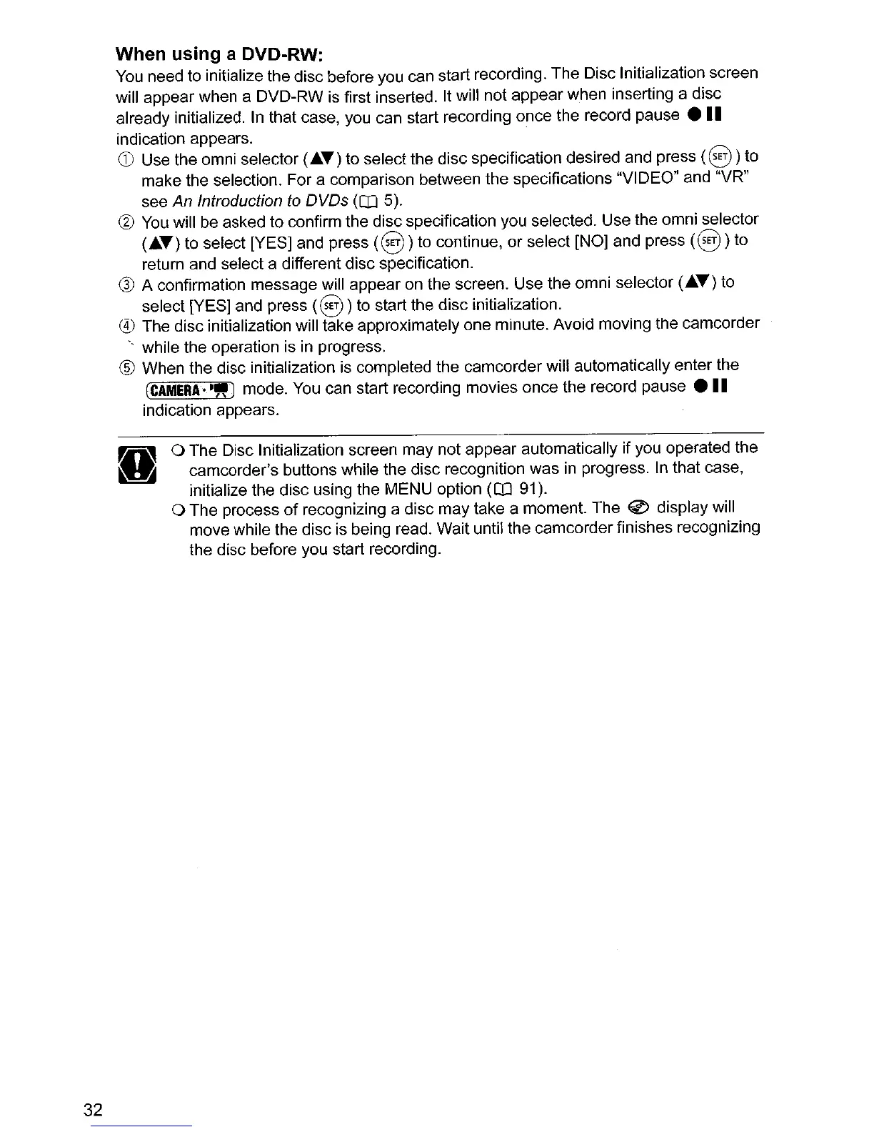 o The Disc Initialization screen may not appear automatically if you operated the