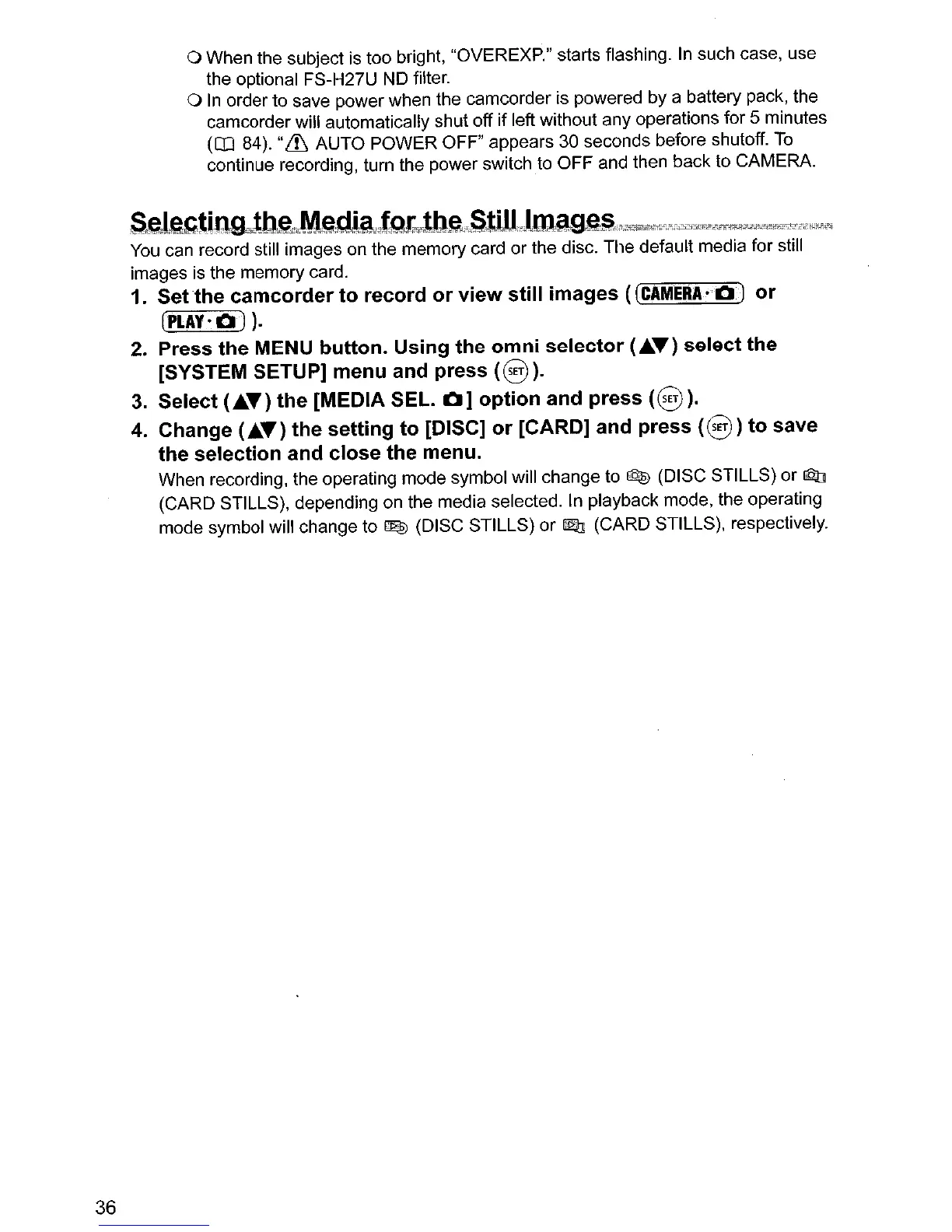 (CARD STILLS), depending on the media selected. In playback mode, the operating