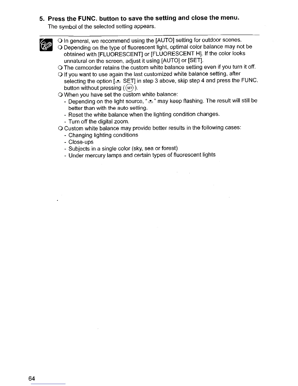 o The camcorder retains the custom white balance setting even if you turn it off.