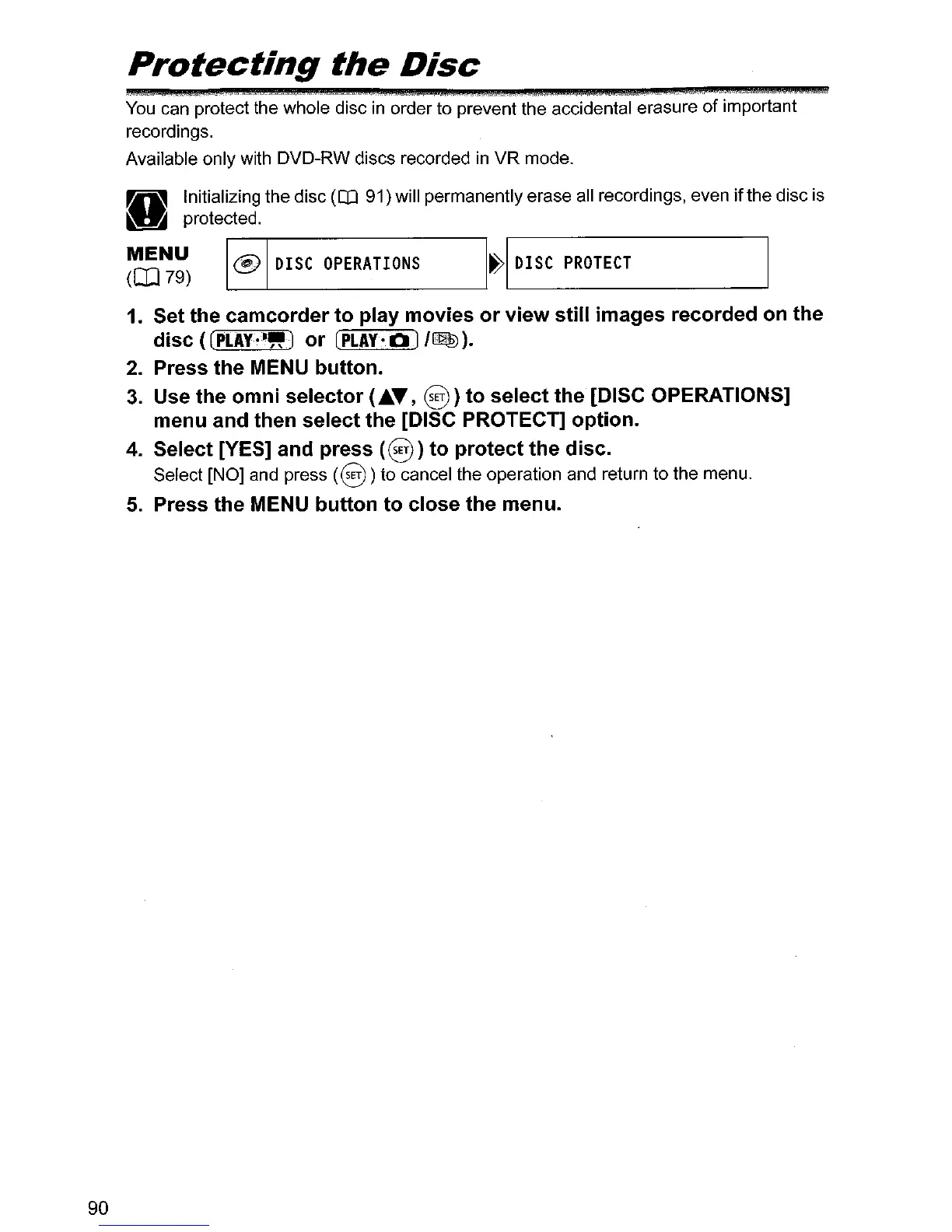 Initializing the disc (OJ 91) will permanently erase all recordings, even ifthe disc is