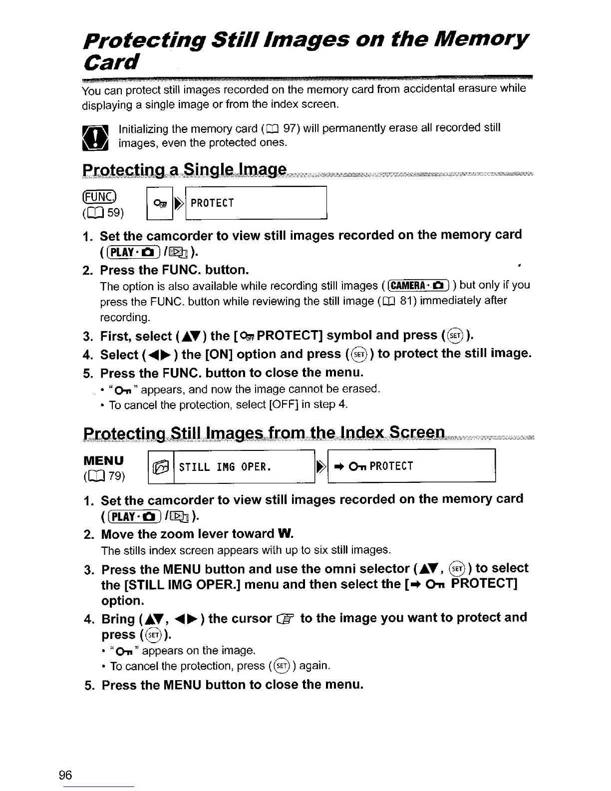 Initializing the memory card (QJ 97) will permanently erase all recorded still