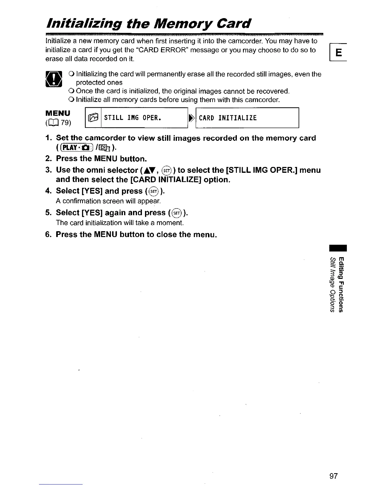 0 Initializing the card will permanently erase all the recorded still images, even the