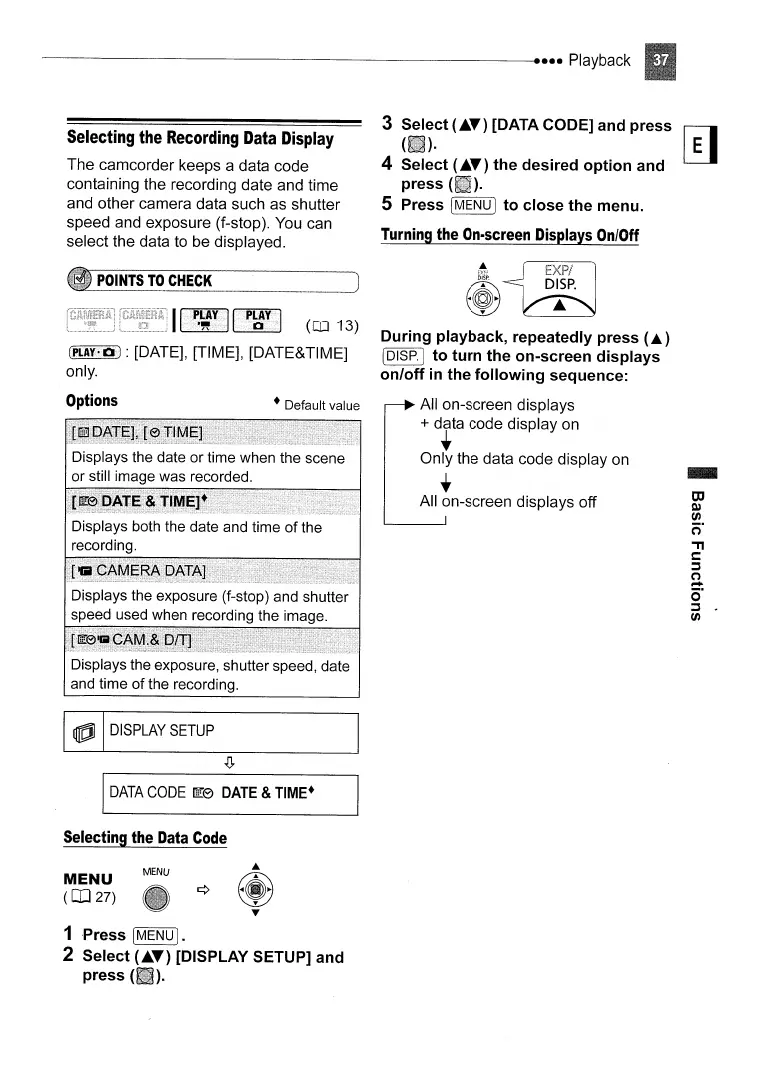 Displays the exposure, shutter speed, date