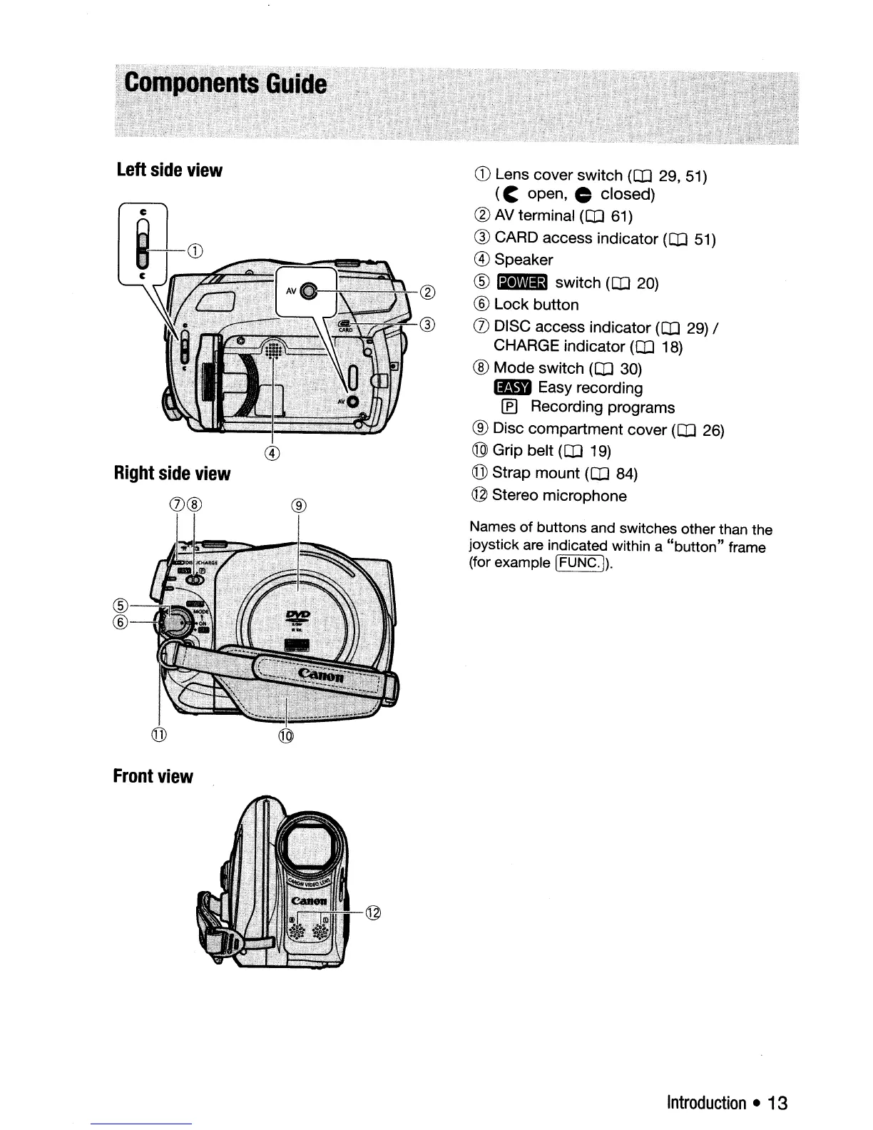 Canon DC310 - Camcorder Component Identification; Left Side View Components; Right and Front View Components