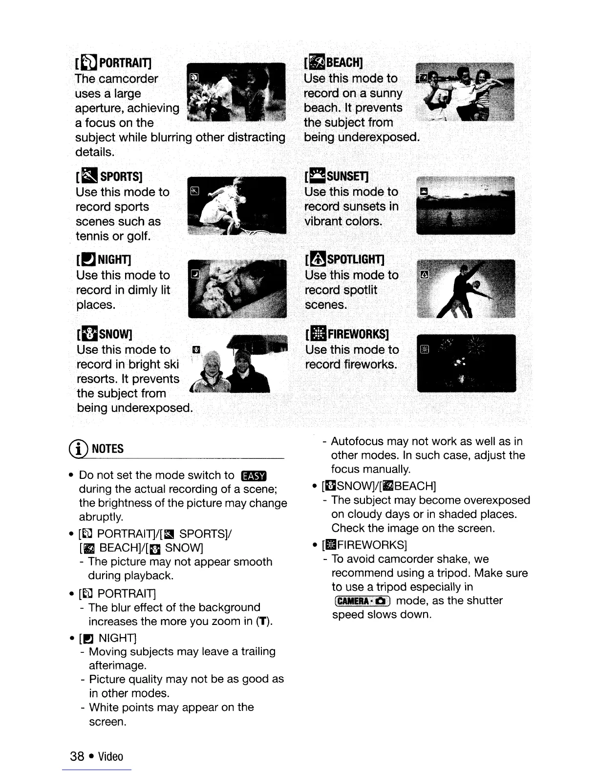 Canon DC310 - Special Scene Recording Program Details; Program Descriptions and Usage Notes