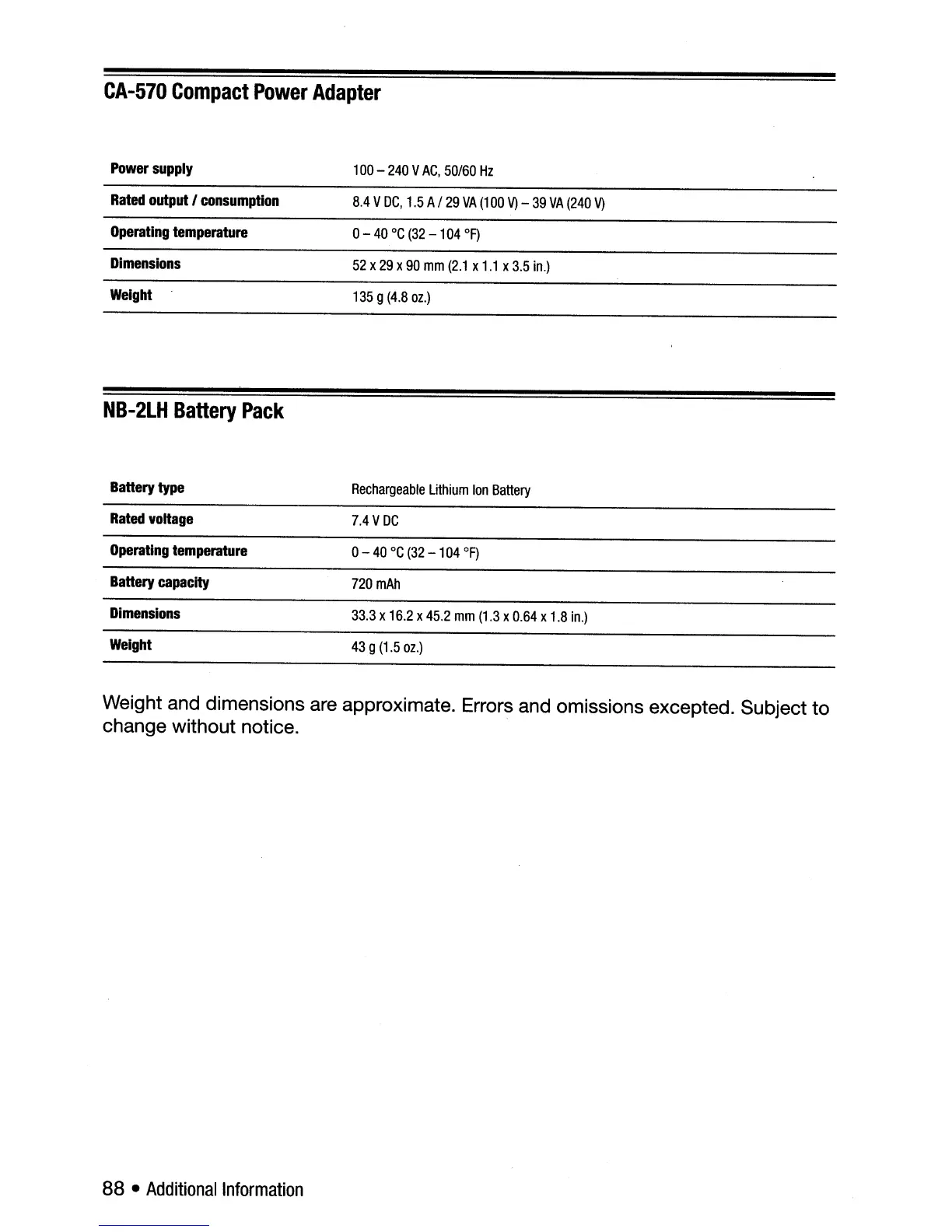 Canon DC310 - Power Adapter and Battery Pack Specifications; CA-570 Compact Power Adapter Specs; NB-2 LH Battery Pack Specs