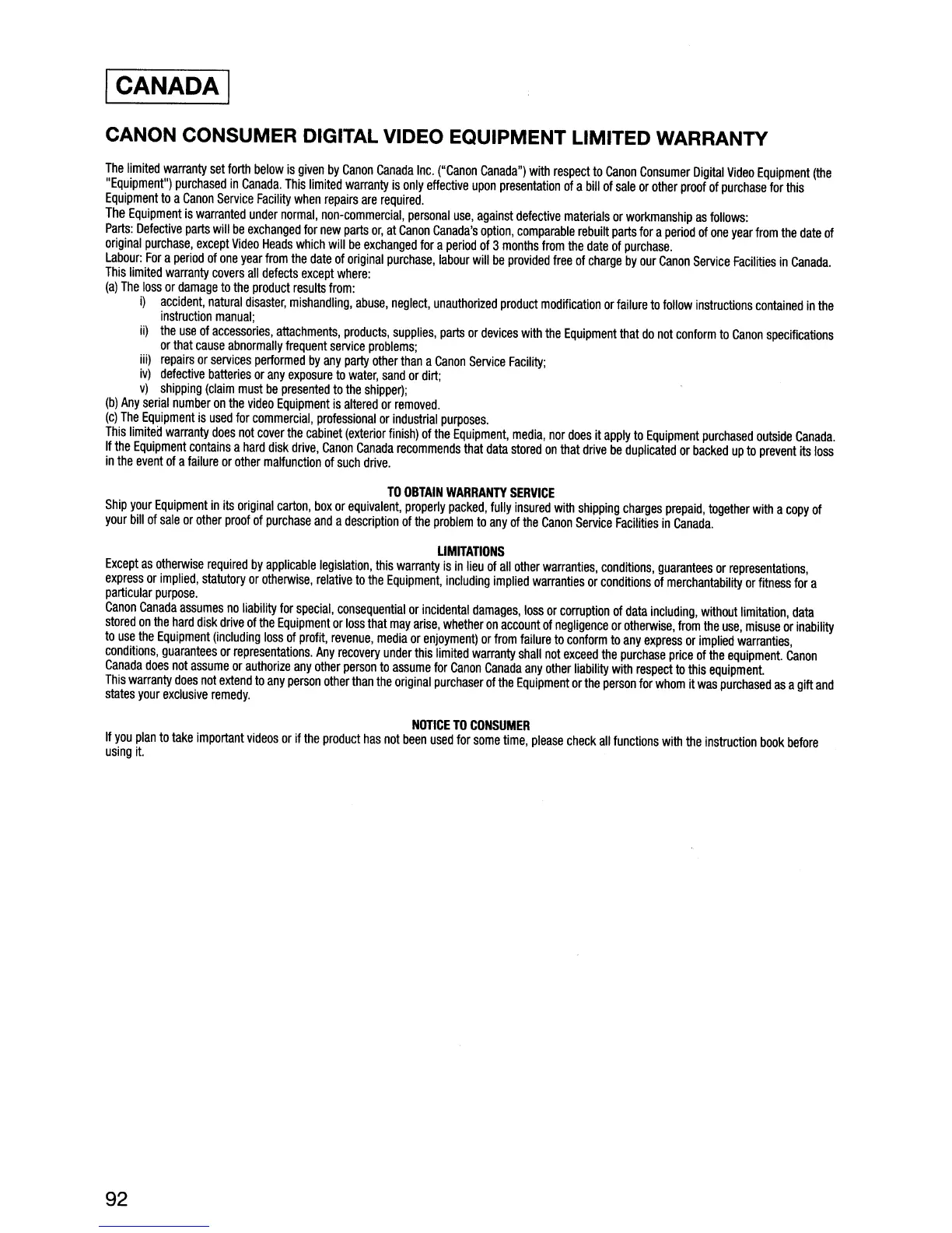 CANON CONSUMER DIGITAL VIDEO EQUIPMENT LIMITED WARRANTY