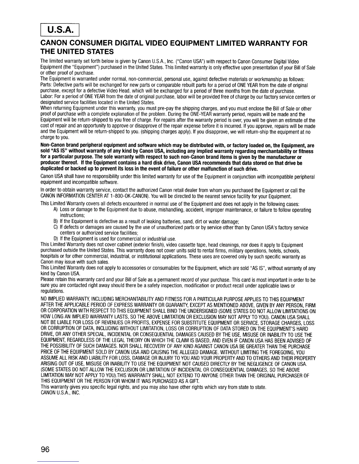 CANON CONSUMER DIGITAL VIDEO EQUIPMENT LIMITED WARRANTY FOR