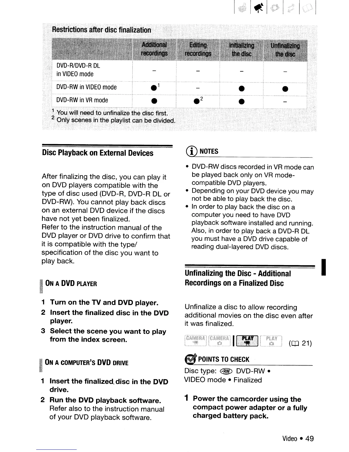 Canon DC420 - Disc Playback on External Devices; Unfinalizing the Disc - Additional Recordings on a Finalized Disc