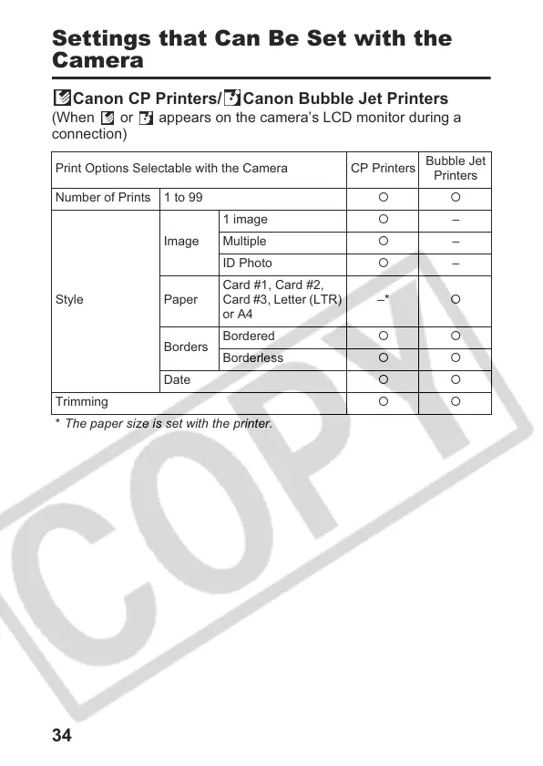 Print Options Selectable with the Camera CP Printers