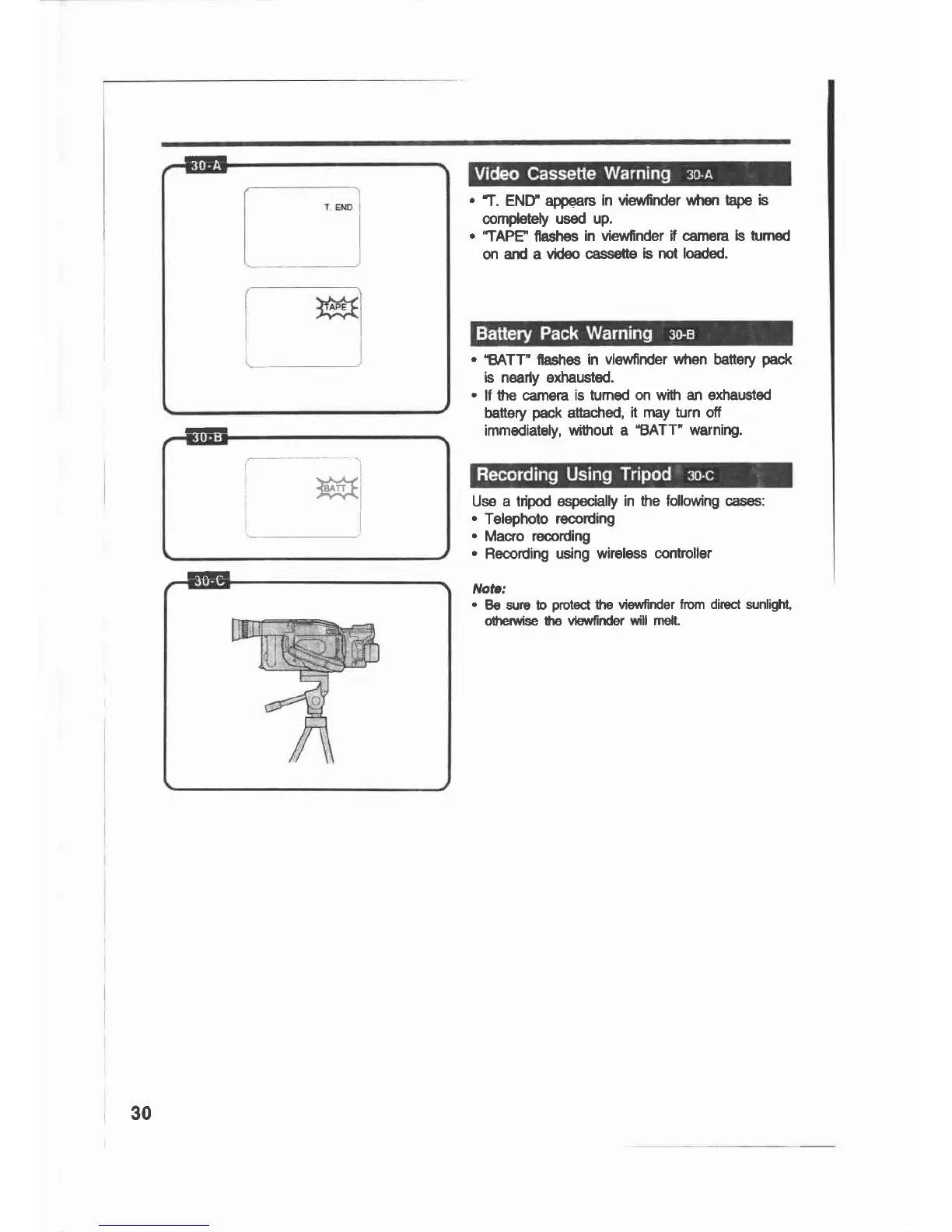 Canon E 200 - Video Cassette Warning; Battery Pack Warning; Recording Using Tripod