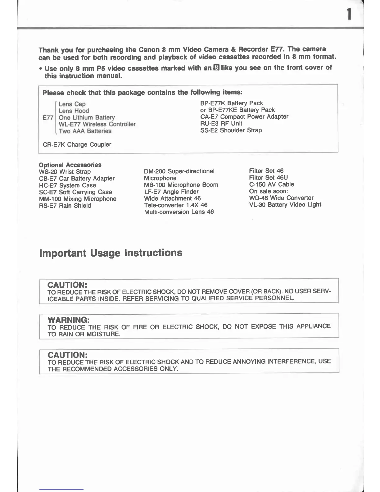 Canon E 77 - Important Usage Instructions; Electric Shock Caution; Fire and Electric Shock Warning; Accessory Caution