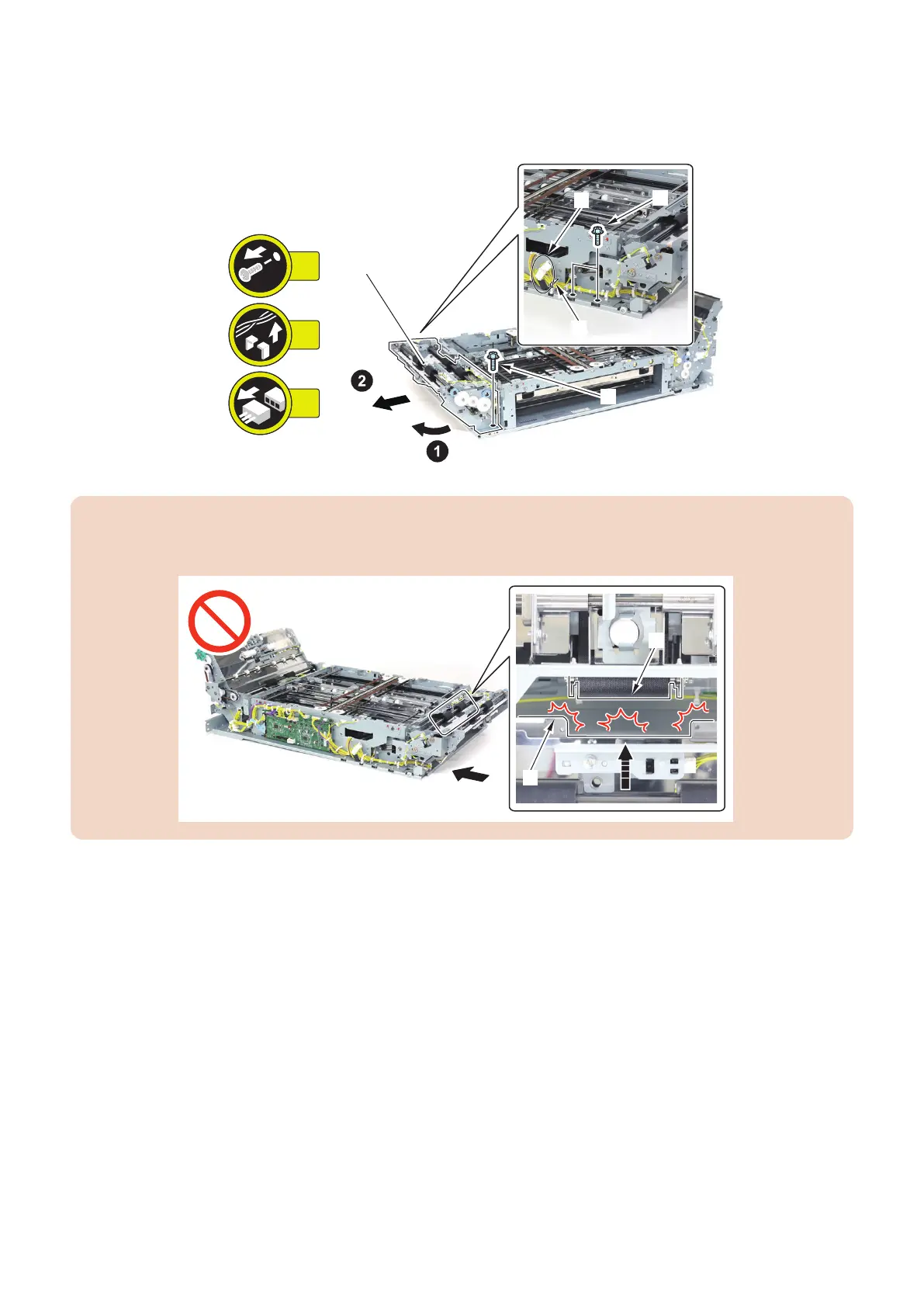 When installing the Through Path Outlet Unit, do not hit the Paper Guide [A] of the Through Path Outlet Unit with the Feed