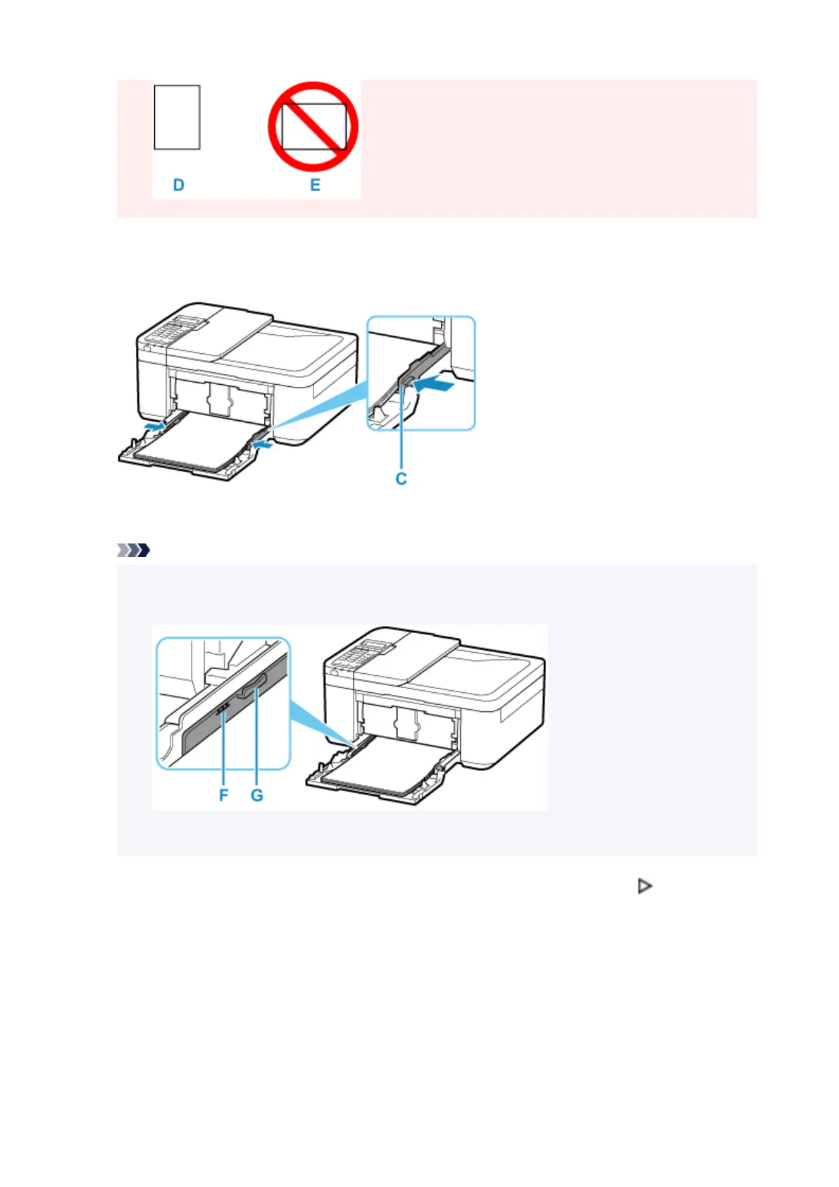 • Keep the paper stack height below the tabs (G) of the paper guides.