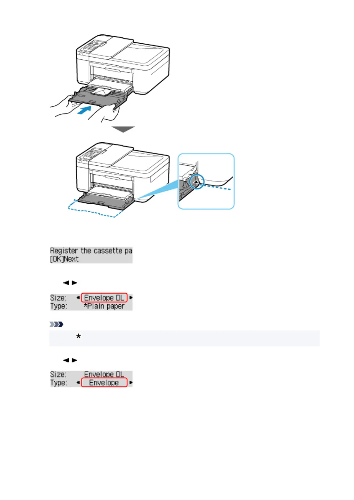 Use button to select size of loaded envelopes in cassette and press OK button.