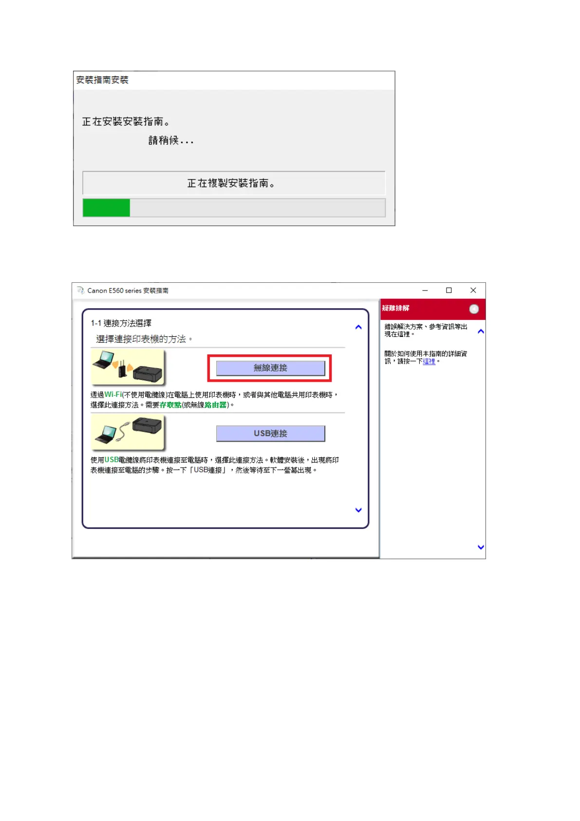 Canon E560 - Select Connection Type; Wait for Initial Installation; Choose Wireless Connection