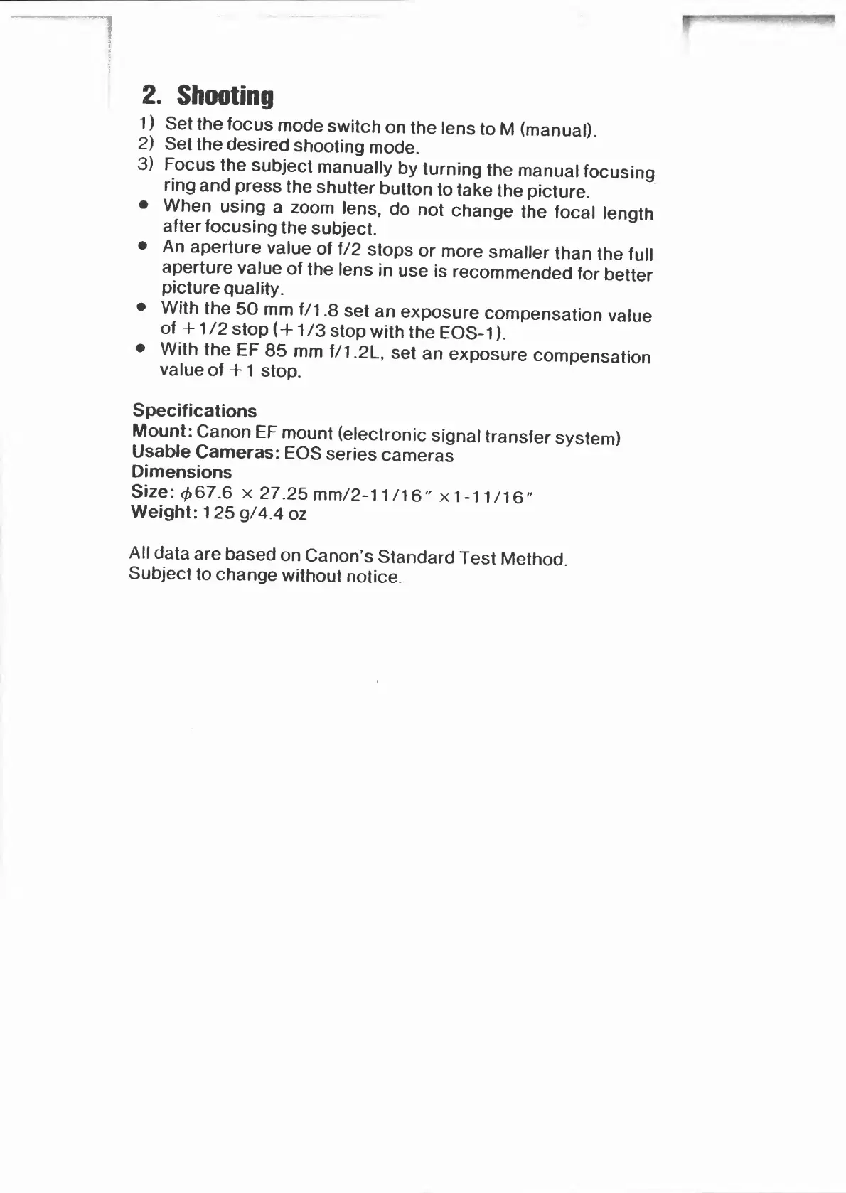 Canon EF 25 - Shooting Instructions and Tips; Technical Specifications